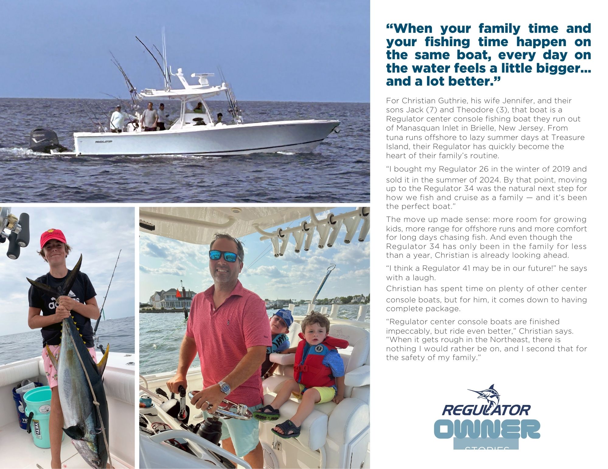 For Christian Guthrie, his wife Jennifer, and their sons Jack (7) and Theodore (3), that boat is a Regulator center console fishing boat they run out of Manasquan Inlet in Brielle, New Jersey. From tuna runs offshore to lazy summer days at Treasure Island, their Regulator has quickly become the heart of their family’s routine.