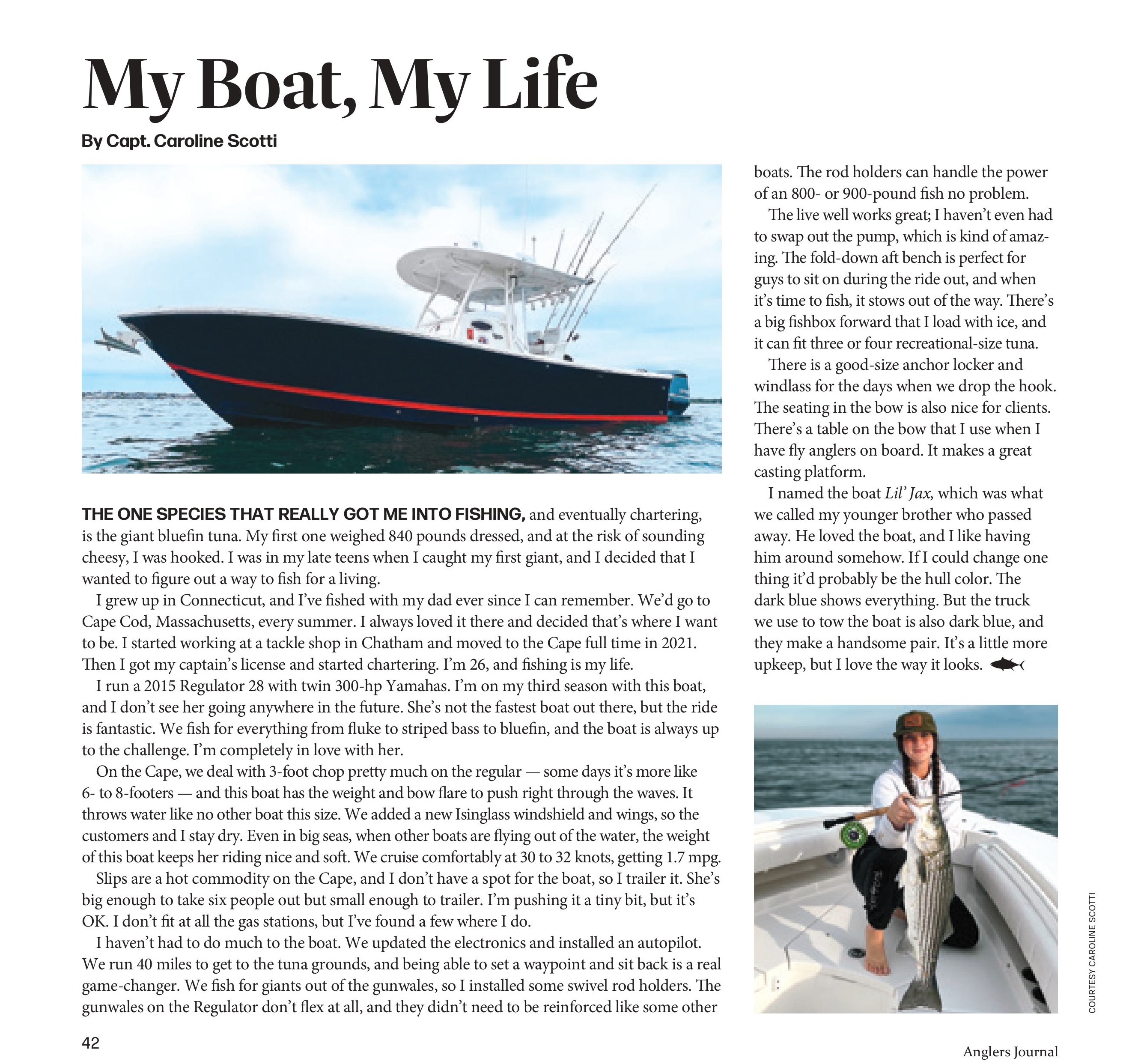 Charter Captain Caroline Scotti runs Jax Charters from her 2015 Regulator 28 center console boat in and around the waters of Cape Cod, Massachusetts. You can follow Caroline’s 28 adventures @jax_charters.